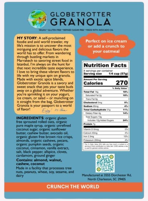 Warm, comforting, and full of soul - Globetrotter Granola's Cha Cha Chai Granola blends cinnamon, black pepper, cardamom, cloves, allspice, and ginger into every golden cluster. Inspired by the rich spice markets of India, it’s perfect over yogurt, oatmeal, or even ice cream. One crunchy bite, and you’re wrapped in the cozy flavors of chai—no mug required.